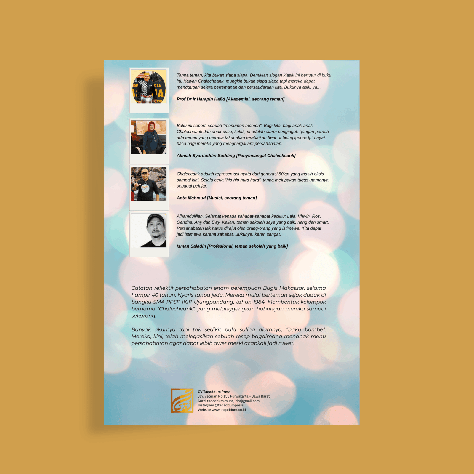 Buku ini menceritakan tentang kisah persahabatan enam perempuan Bugis – Makassar yang bertahan lebih dari empat dekade, menelusuri perjalanan masa muda, cinta, dan nilai kehidupan yang abadi sepanjang waktu.